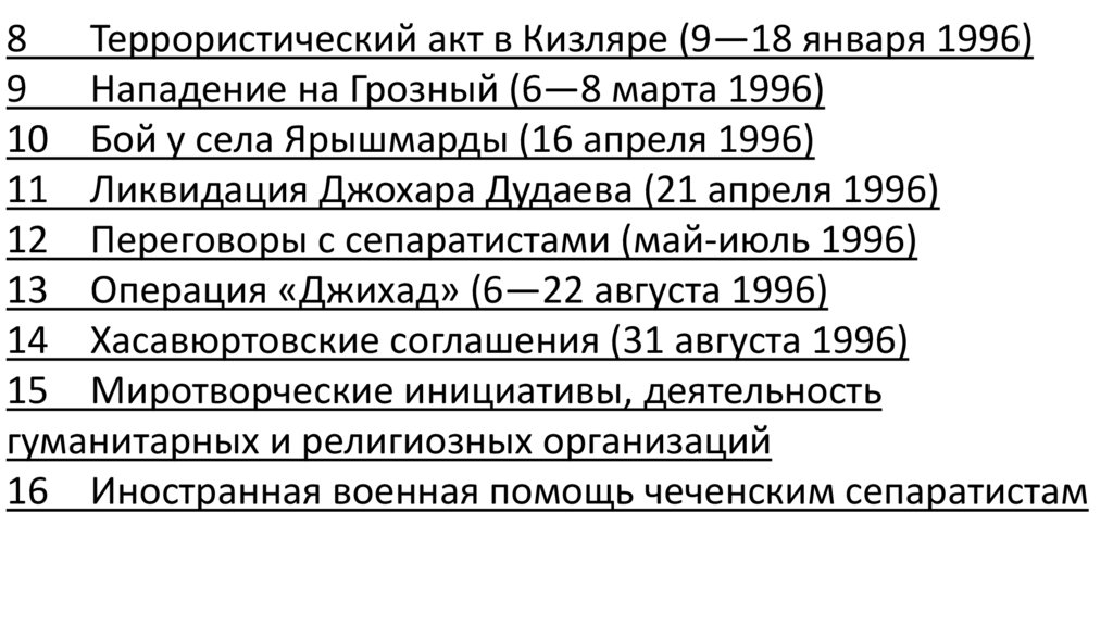 8 Террористический акт в Кизляре (9—18 января 1996)9 Нападение на Грозный (6—8 марта 1996)