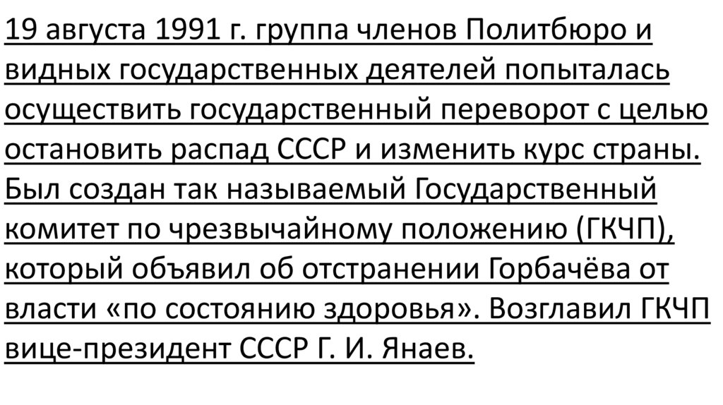 19 августа 1991 г. группа членов Политбюро ивидных государственных деятелей попыталась