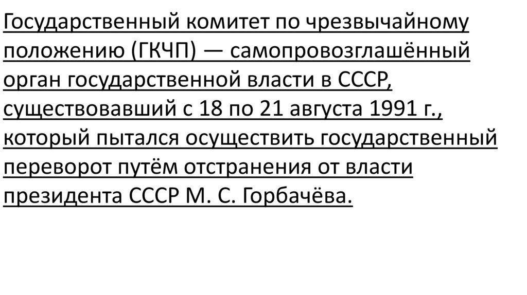 Государственный комитет по чрезвычайномуположению (ГКЧП) — самопровозглашённый
