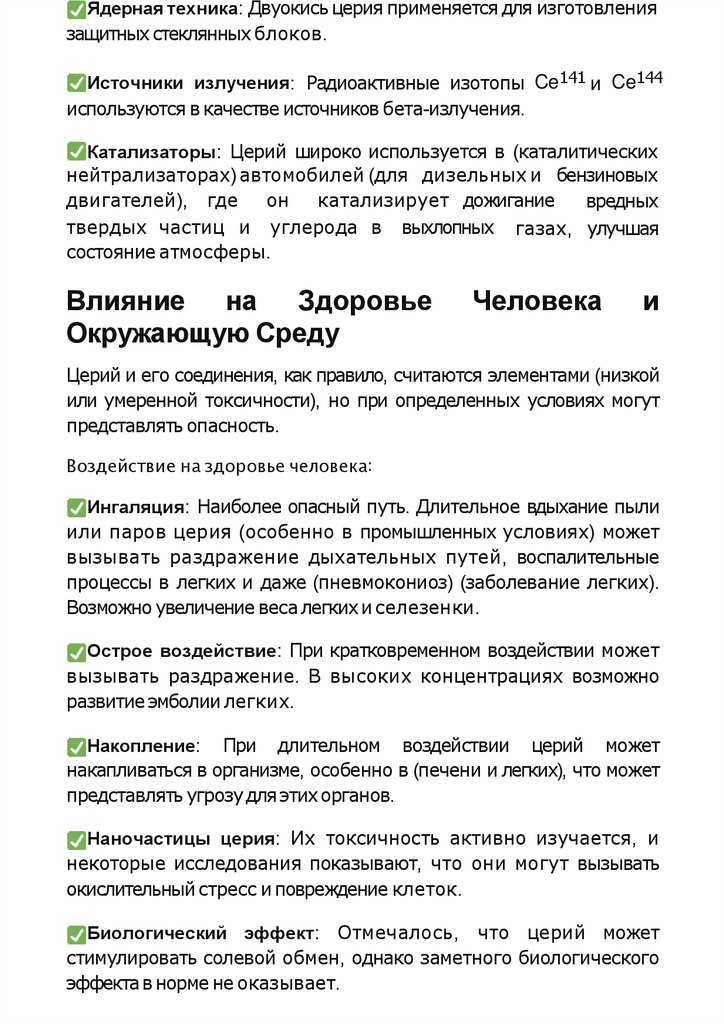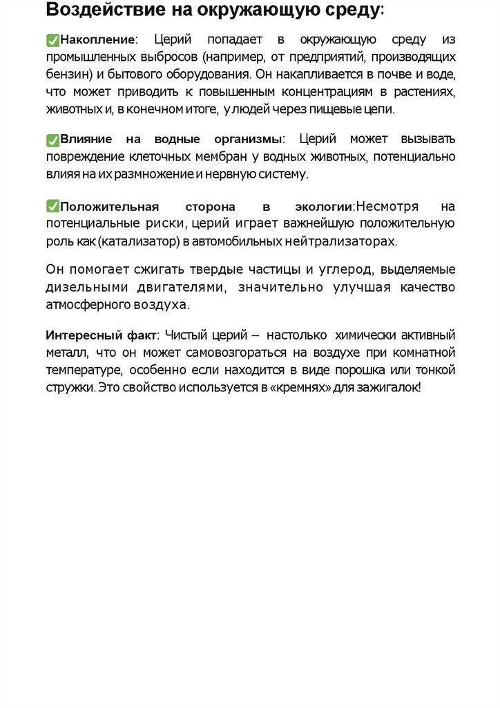 Воздействие на окружающую среду:Накопление: Церий попадает в окружающую среду из