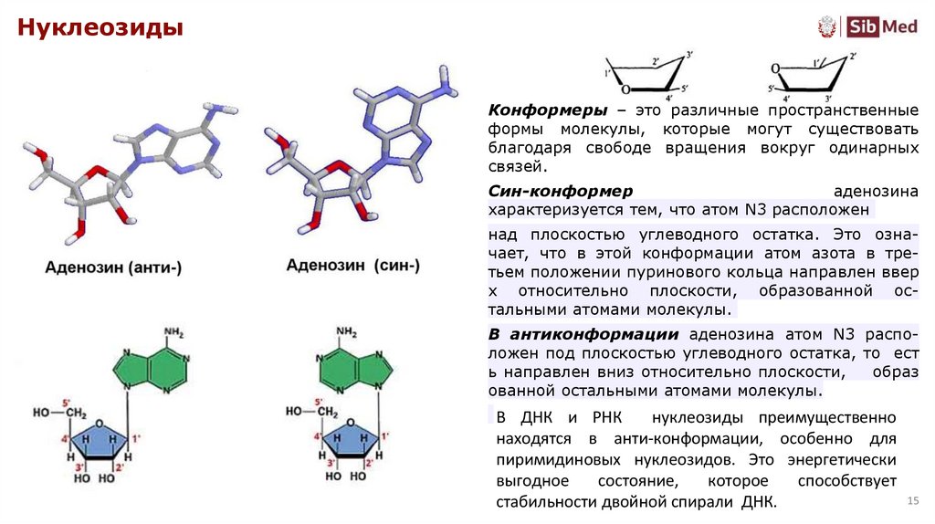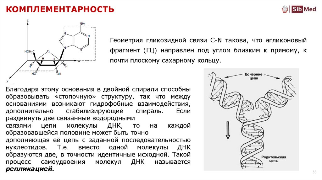 КОМПЛЕМЕНТАРНОСТЬГеометрия гликозидной связи C-N такова, что агликоновый