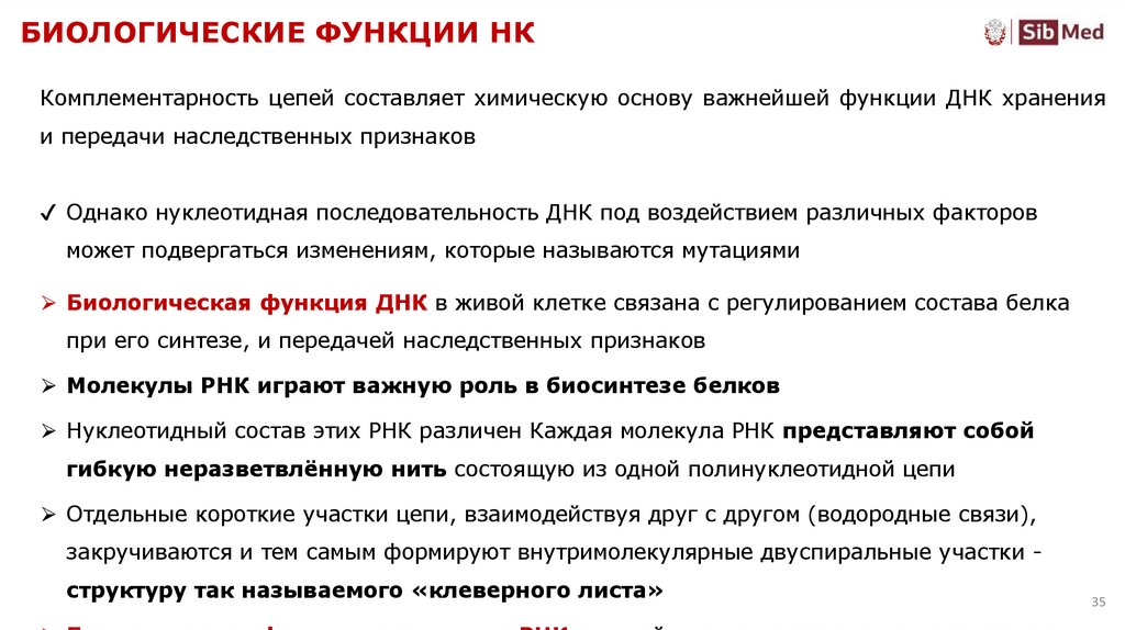 БИОЛОГИЧЕСКИЕ ФУНКЦИИ НККомплементарность цепей составляет химическую основу важнейшей функции ДНК хранения