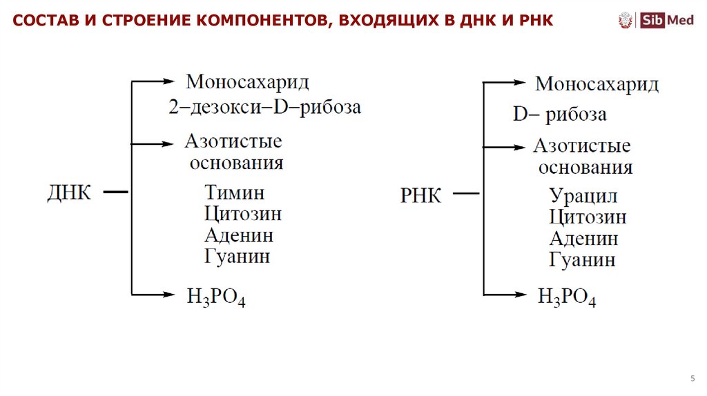 СОСТАВ И СТРОЕНИЕ КОМПОНЕНТОВ, ВХОДЯЩИХ В ДНК И РНК5