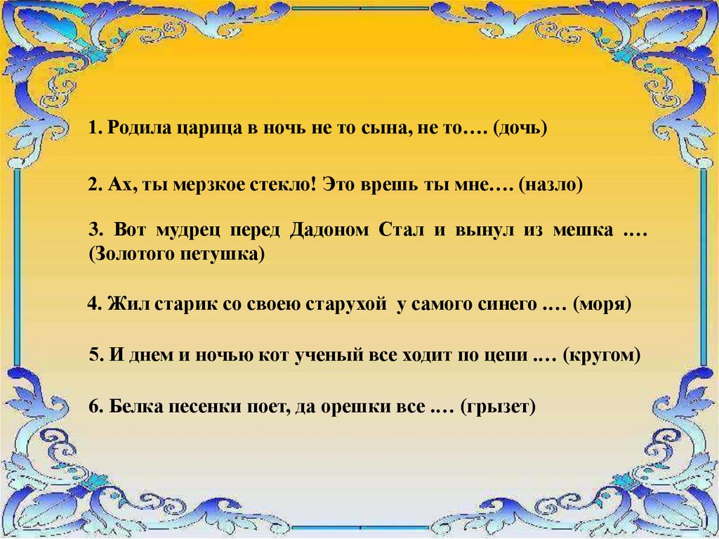 1. Родила царица в ночь не то сына, не то…. (дочь)2. Ах, ты мерзкое стекло! Это врешь ты мне…. (назло)