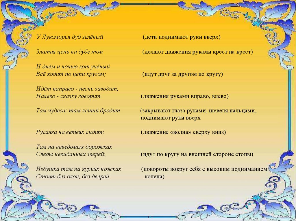 У Лукоморья дуб зелёный(дети поднимают руки вверх)