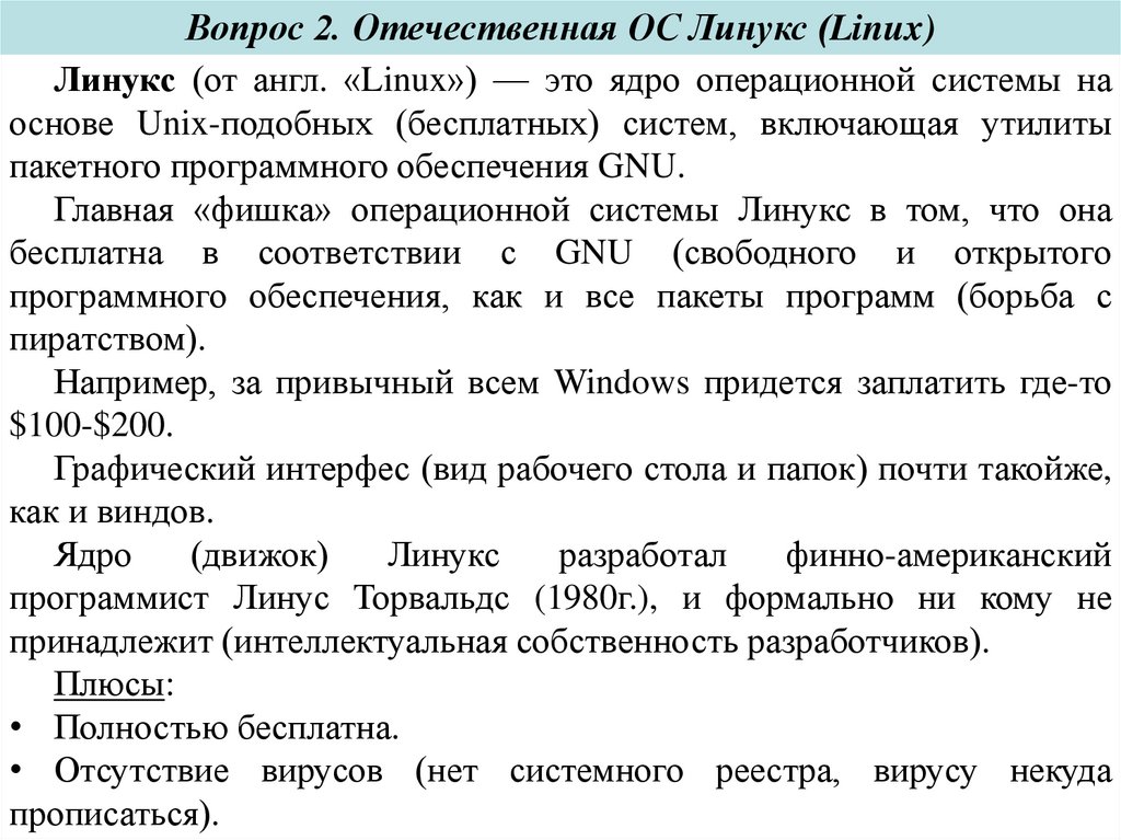 Вопрос 2. Отечественная ОС Линукс (Linux)Линукс (от англ. «Linux») — это ядро операционной системы на