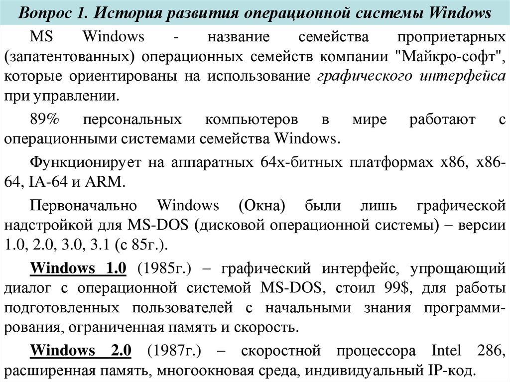 Вопрос 1. История развития операционной системы WindowsMS