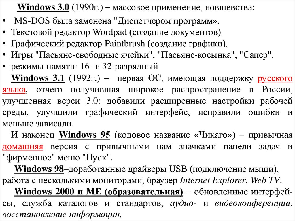 Windows 3.0 (1990г.) – массовое применение, новшевства:• MS-DOS была заменена "Диспетчером программ».