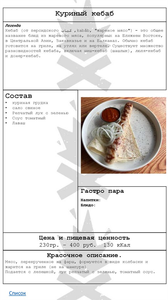 • Кебаб куриный