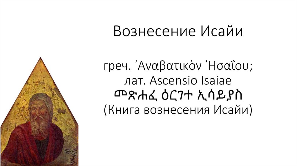 1. Вознесение Исайи греч. ᾿Αναβατικὸν ᾿Ησαΐου; лат. Ascensio Isaiae መጽሐፈ ዕርገተ ኢሳይያስ (Книга вознесения Исайи)