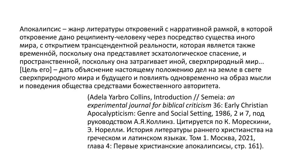 Апокалипсис – жанр литературы откровений с нарративной рамкой, в которойоткровение дано реципиенту-человеку через посредство существа иного