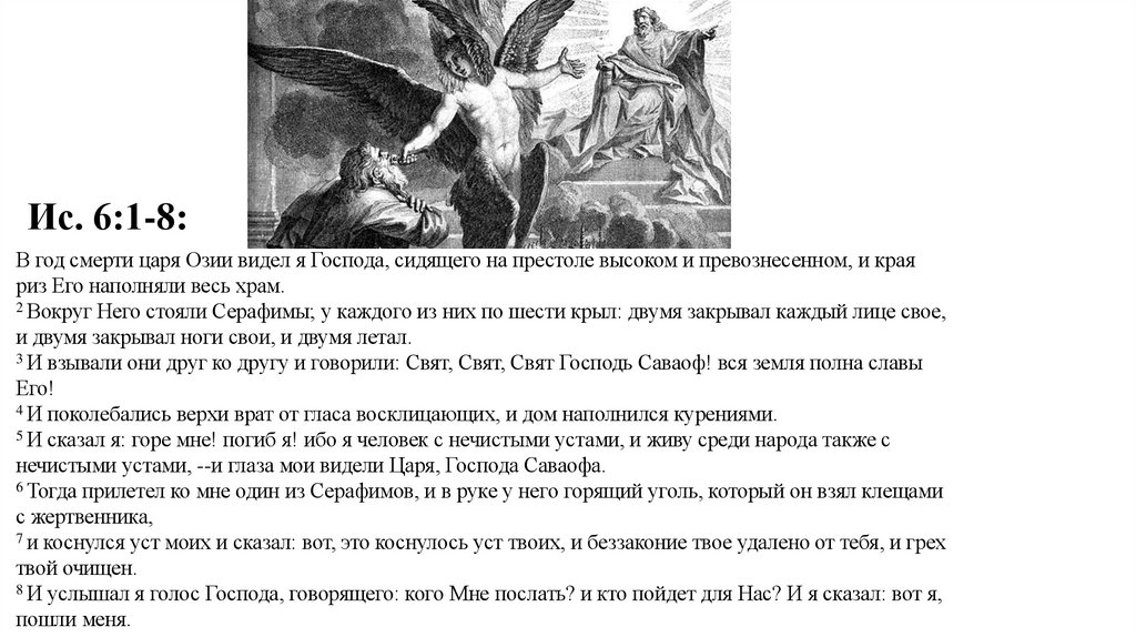Ис. 6:1-8:В год смерти царя Озии видел я Господа, сидящего на престоле высоком и превознесенном, и края