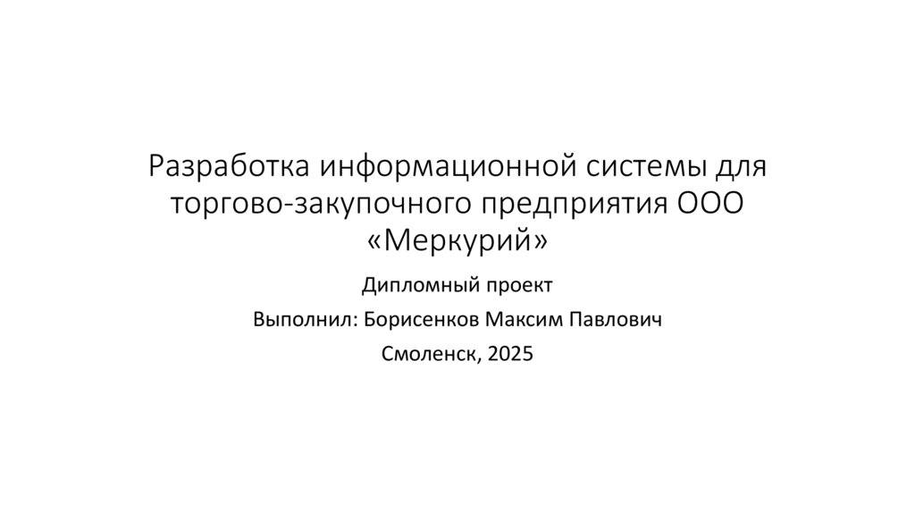 • Цель работы: разработка информационной системы для автоматизации процессовуправления заказами, клиентами и складскими операциями в ООО «Меркурий».
