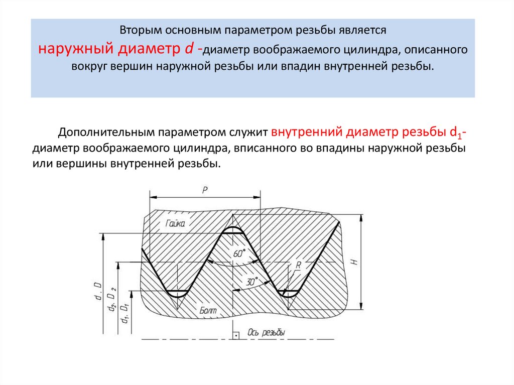 Вторым основным параметром резьбы являетсянаружный диаметр d -диаметр воображаемого цилиндра, описанного