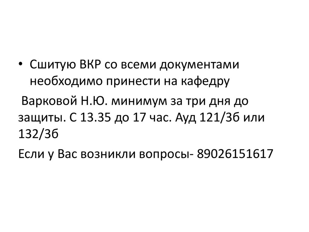 • Сшитую ВКР со всеми документаминеобходимо принести на кафедру