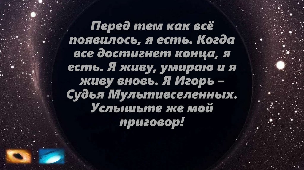1. Перед тем как всё появилось, я есть. Когда все достигнет конца, я есть. Я живу, умираю и я живу вновь. Я Игорь – Судья