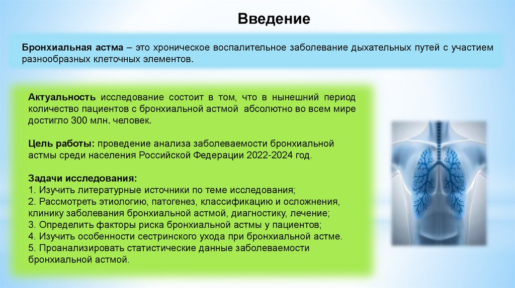 ВведениеБронхиальная астма – это хроническое воспалительное заболевание дыхательных путей с участием