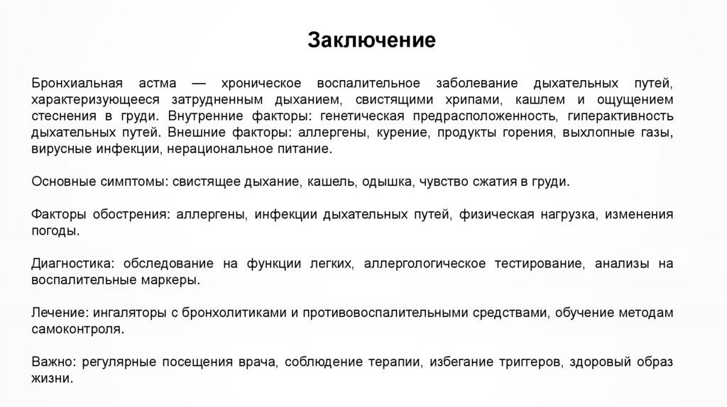 ЗаключениеБронхиальная астма — хроническое воспалительное заболевание дыхательных путей,