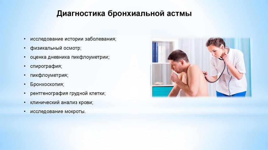 Диагностика бронхиальной астмы• исследование истории заболевания;