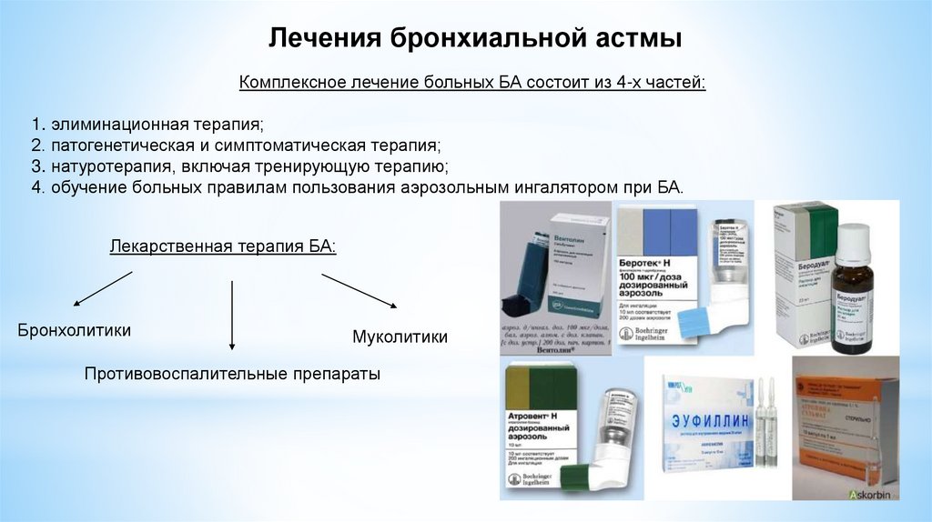 Лечения бронхиальной астмыКомплексное лечение больных БА состоит из 4-х частей: