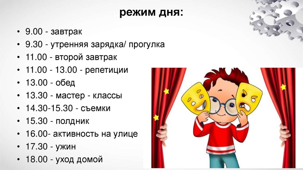 режим дня:• 9.00 - завтрак