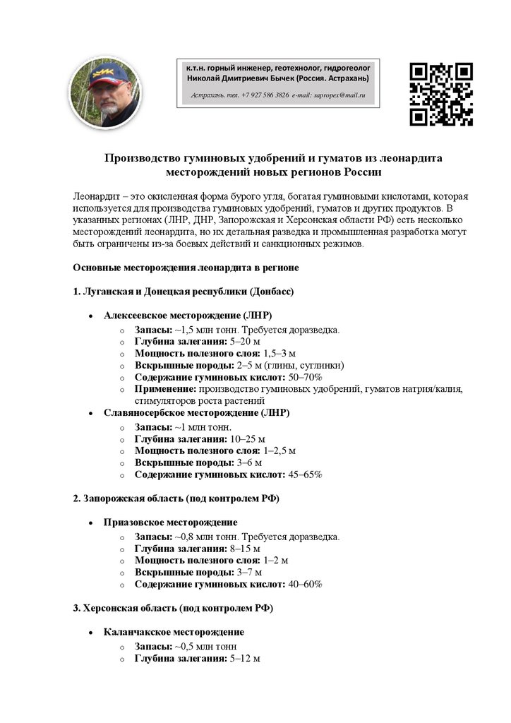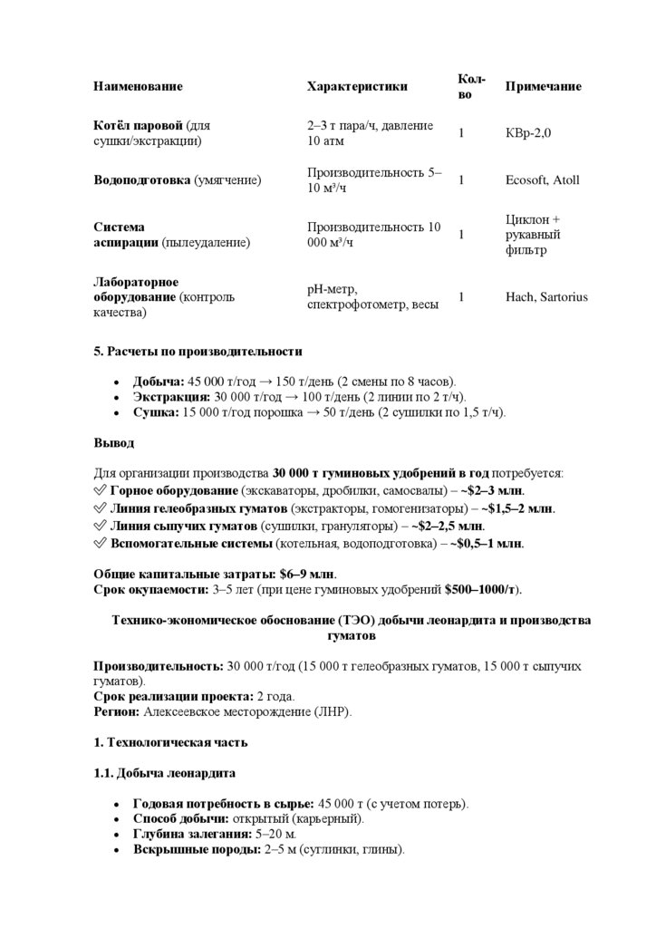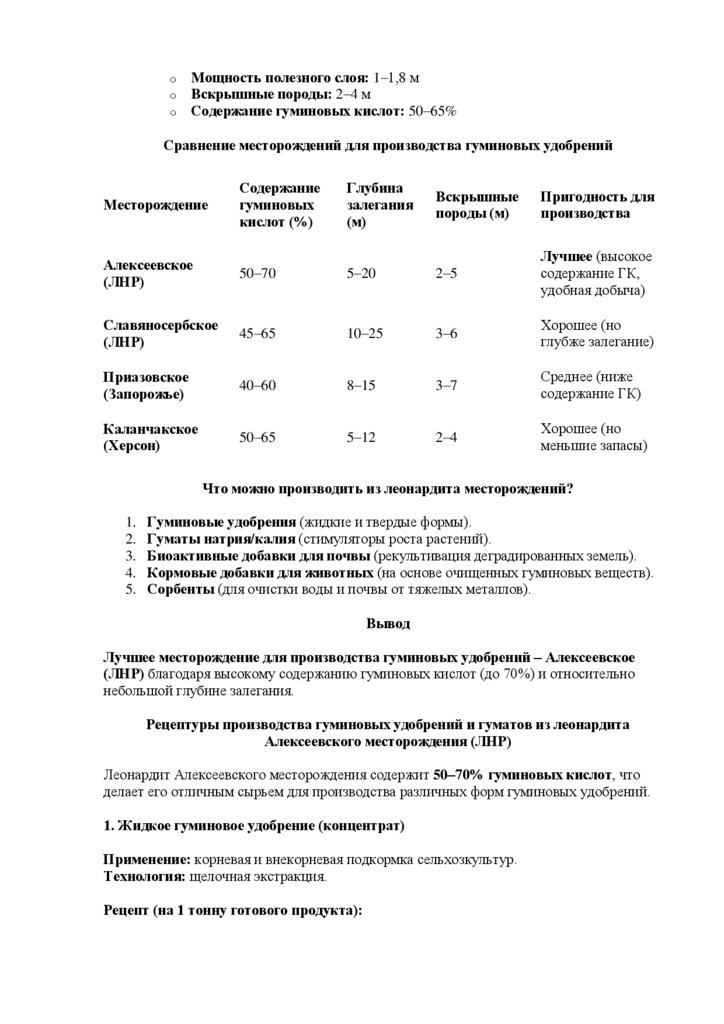Производство гуминовых удобрений и гуматов из леонардита месторождений новых регионов России