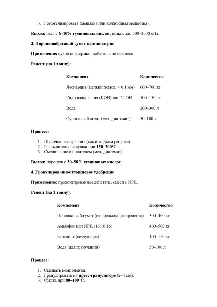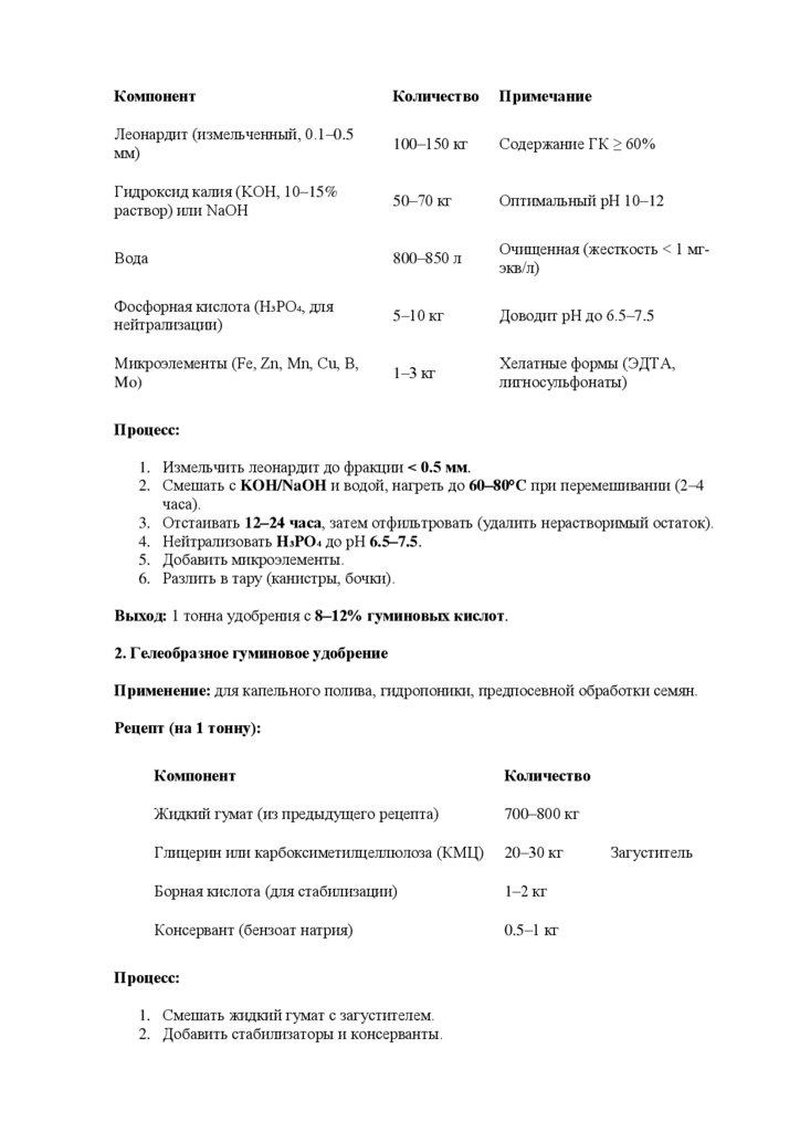 Рецептуры производства гуминовых удобрений и гуматов из леонардита