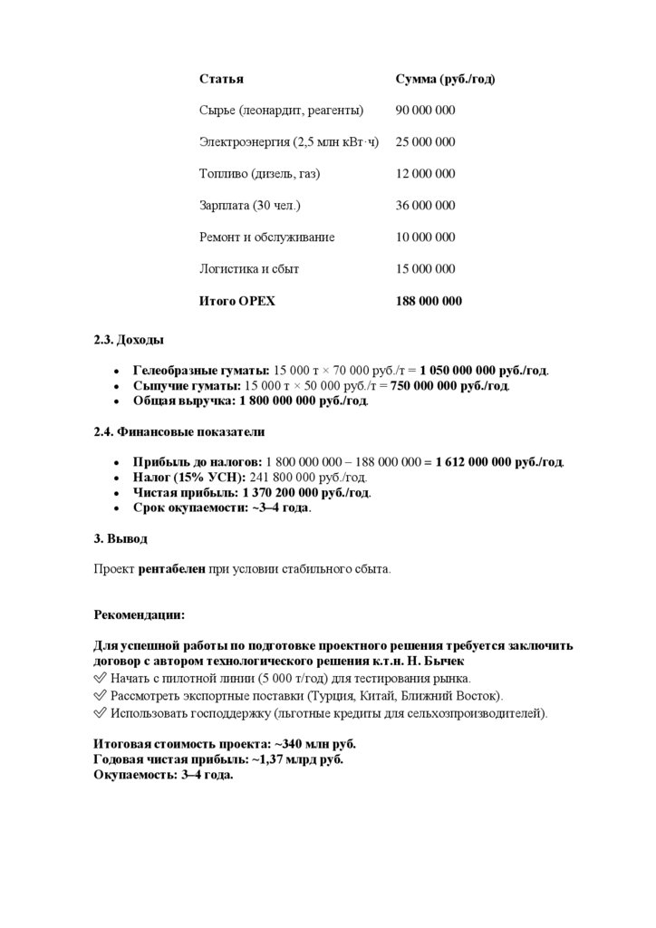 Гелеобразные гуматы: 15 000 т × 70 000 руб./т = 1 050 000 000 руб./год.