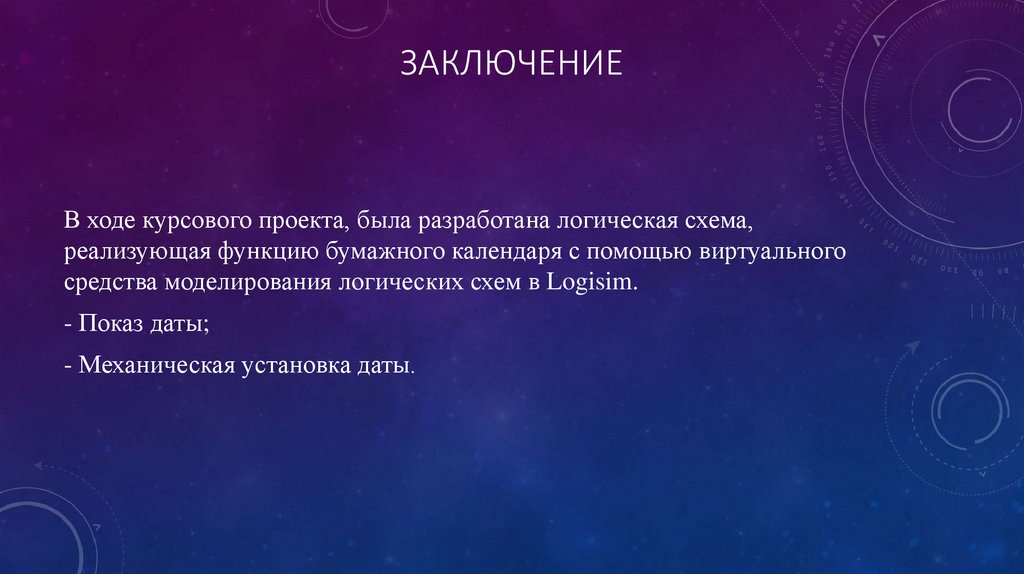 В ходе курсового проекта, была разработана логическая схема,реализующая функцию бумажного календаря с помощью виртуального