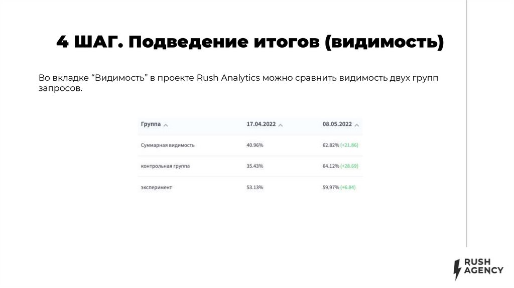Во вкладке “Видимость” в проекте Rush Analytics можно сравнить видимость двух группзапросов.