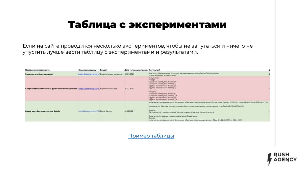 Если на сайте проводится несколько экспериментов, чтобы не запутаться и ничего неупустить лучше вести таблицу с экспериментами и результатами.
