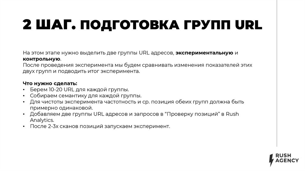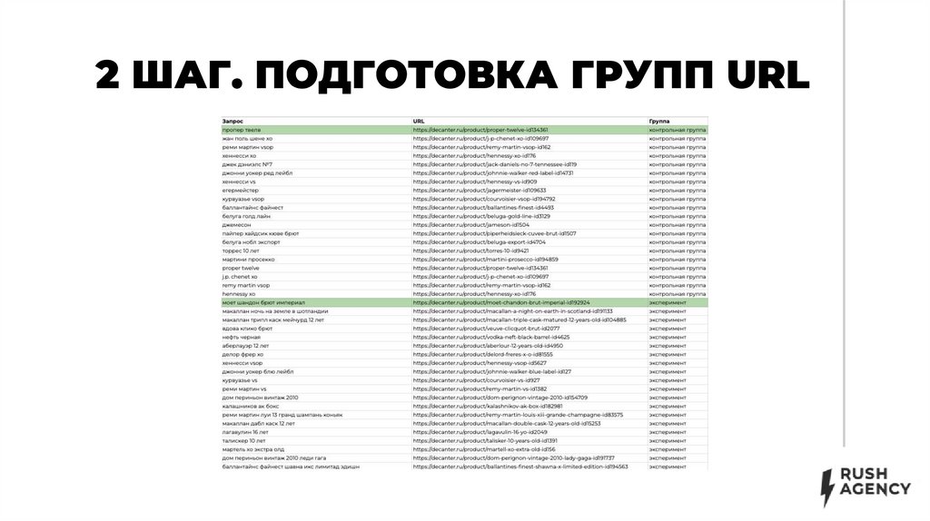 На этом этапе нужно выделить две группы URL адресов, экспериментальную иконтрольную.