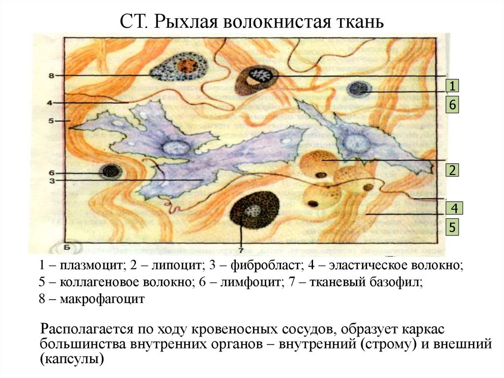5 – коллагеновое волокно; 6 – лимфоцит; 7 – тканевый базофил;