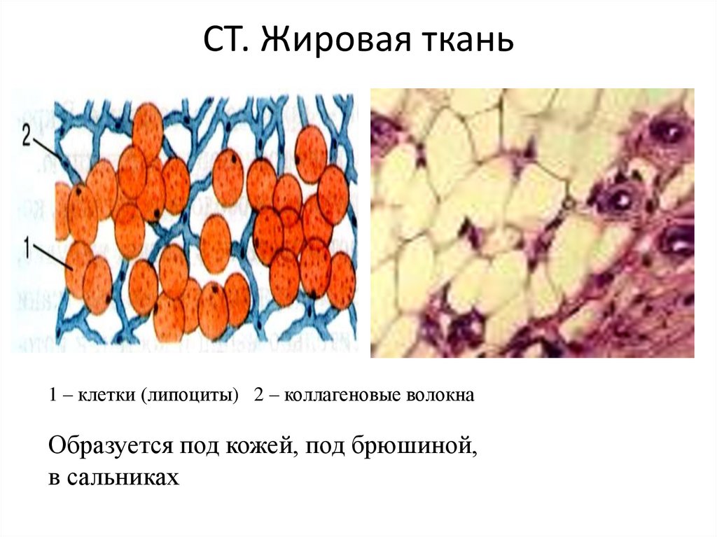 СТ. Жировая ткань1 – клетки (липоциты) 2 – коллагеновые волокна