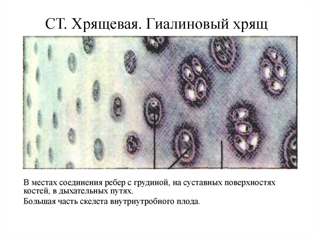 СТ. Хрящевая. Гиалиновый хрящВ местах соединения ребер с грудиной, на суставных поверхностях