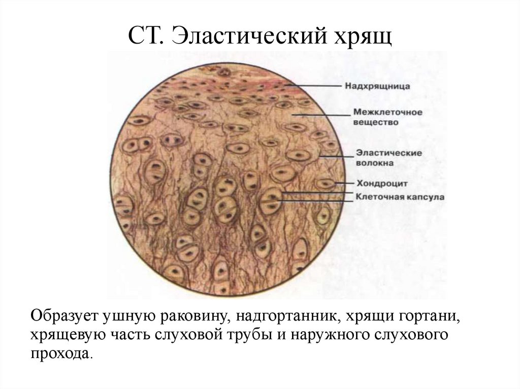 СТ. Эластический хрящОбразует ушную раковину, надгортанник, хрящи гортани,