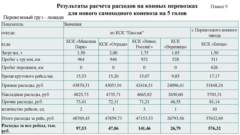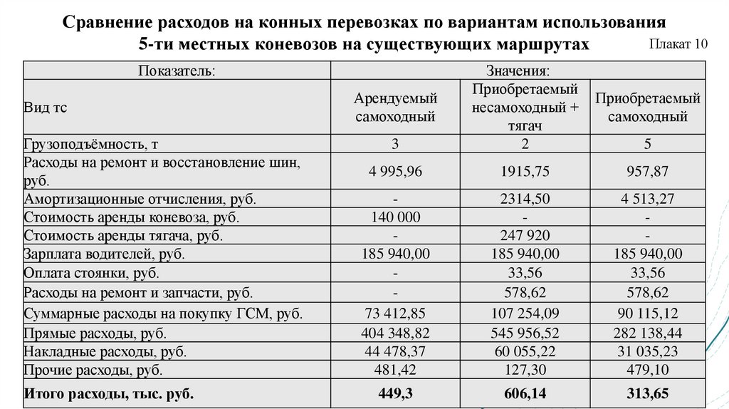 Сравнение расходов на конных перевозках по вариантам использованияПлакат 10
