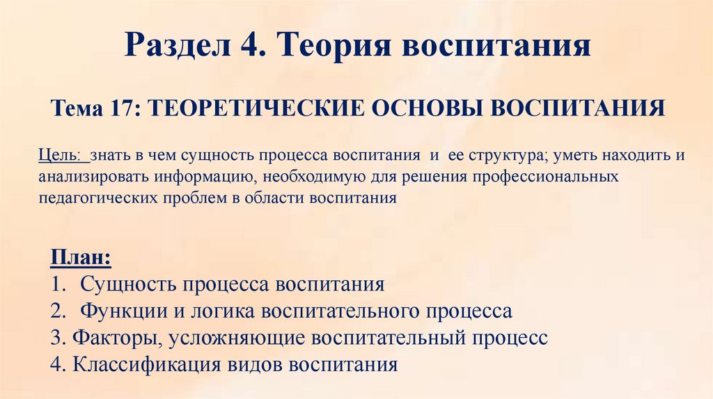 Раздел 4. Теория воспитанияТема 17: ТЕОРЕТИЧЕСКИЕ ОСНОВЫ ВОСПИТАНИЯ