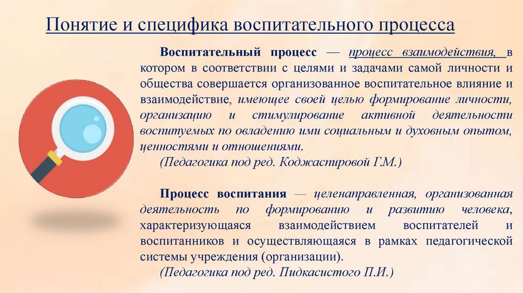 Понятие и специфика воспитательного процессаВоспитательный процесс — процесс взаимодействия, в