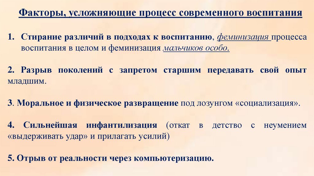 Факторы, усложняющие процесс современного воспитания1. Стирание различий в подходах к воспитанию, феминизация процесса
