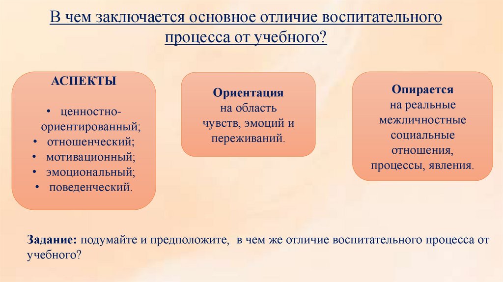 Задание: подумайте и предположите, в чем же отличие воспитательного процесса от