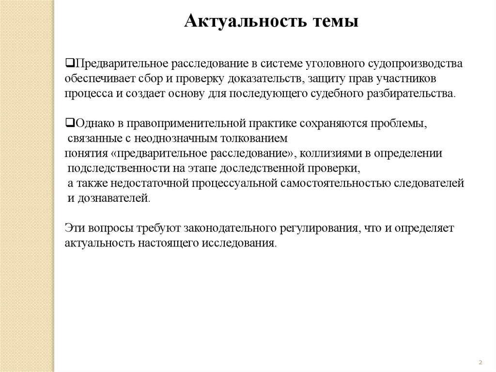 Актуальность темыПредварительное расследование в системе уголовного судопроизводства