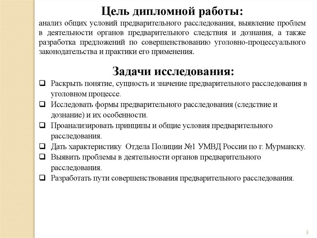 Цель дипломной работы:анализ общих условий предварительного расследования, выявление проблем