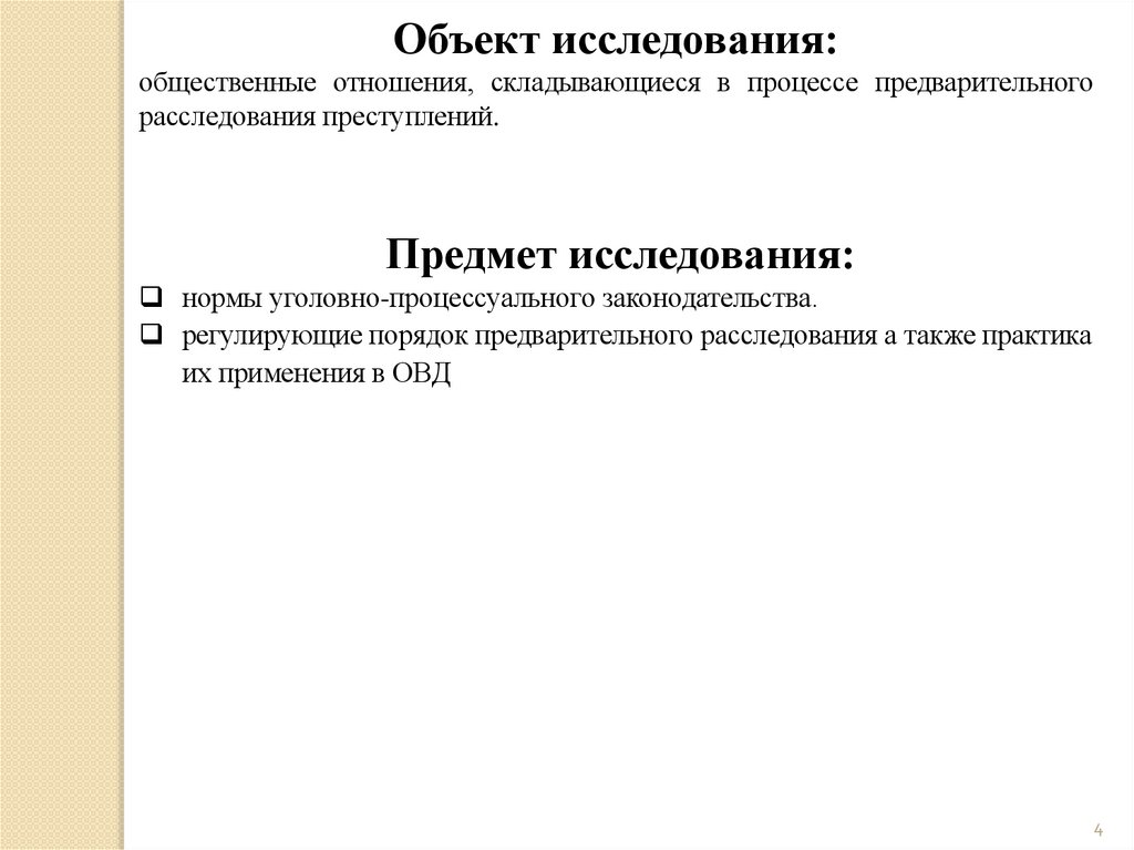Объект исследования:общественные отношения, складывающиеся в процессе предварительного