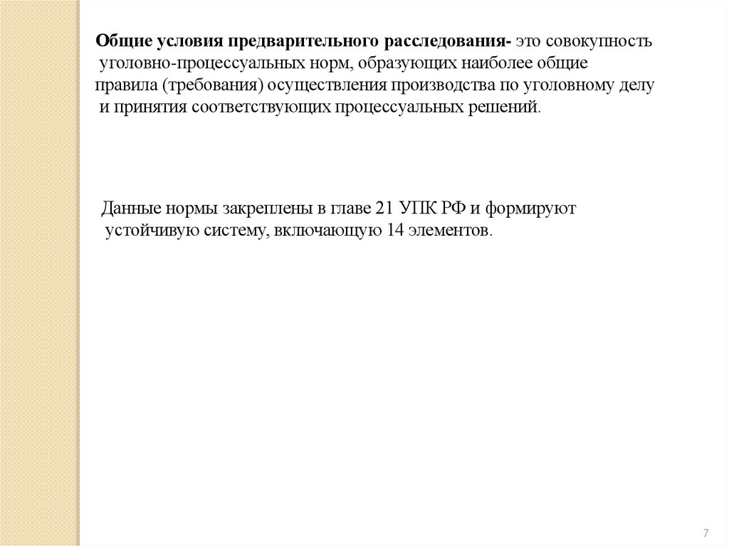 Общие условия предварительного расследования- это совокупностьуголовно-процессуальных норм, образующих наиболее общие