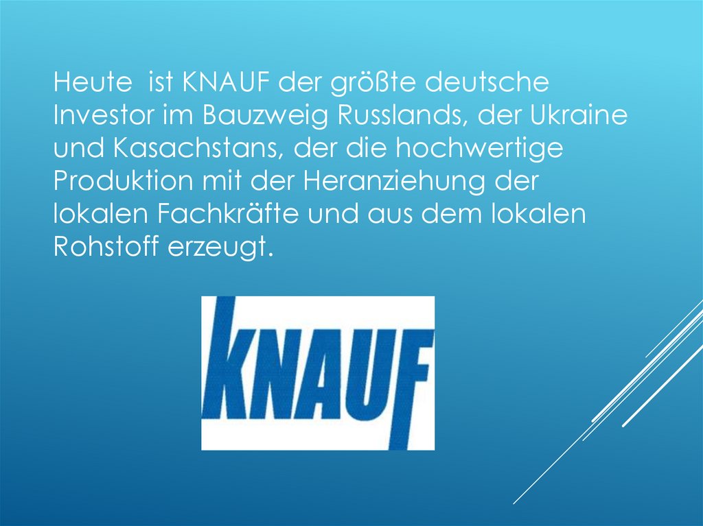 Heute ist KNAUF der größte deutscheInvestor im Bauzweig Russlands, der Ukraine