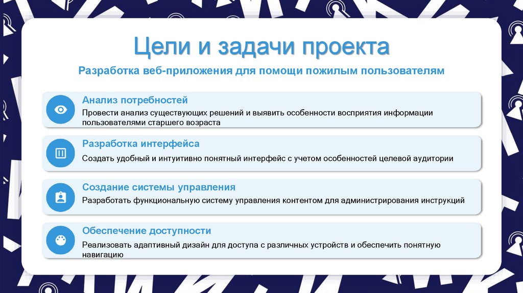 Цели и задачи проектаРазработка веб-приложения для помощи пожилым пользователям