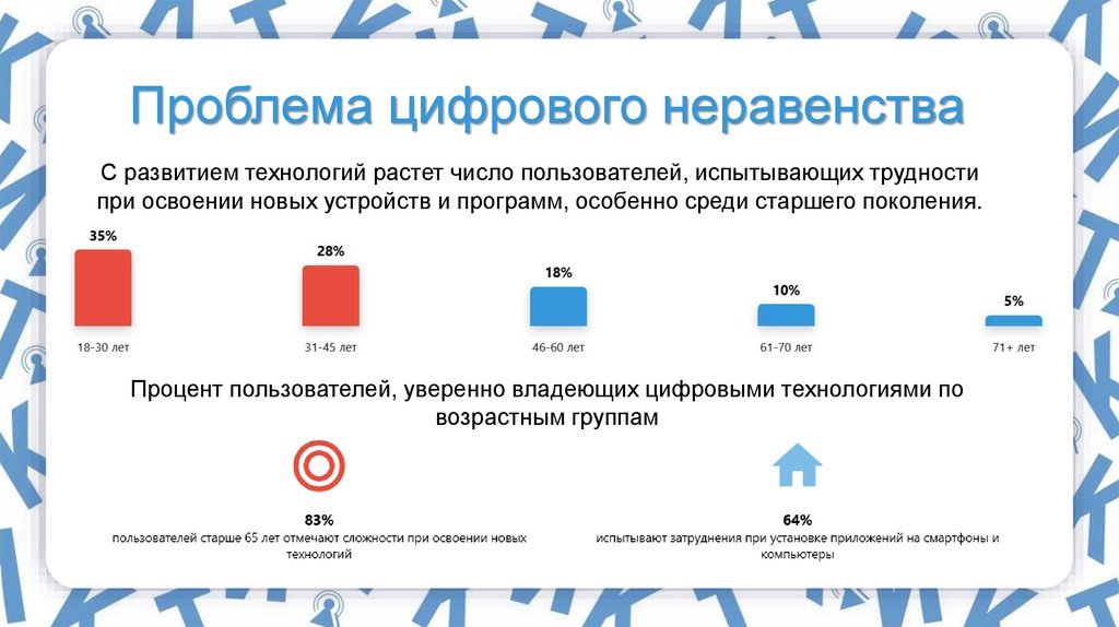 Проблема цифрового неравенстваС развитием технологий растет число пользователей, испытывающих трудности