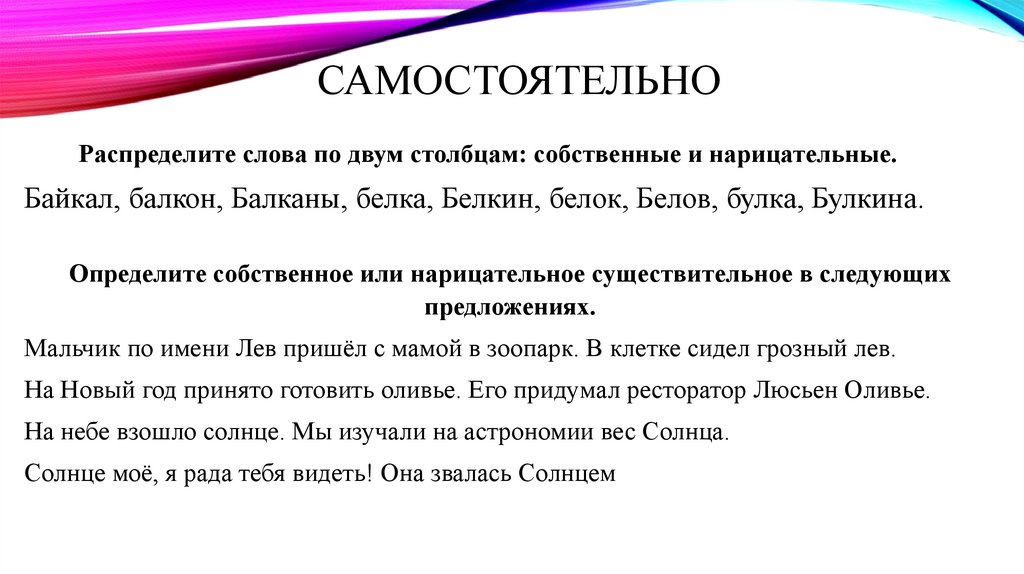 САМОСТОЯТЕЛЬНОРаспределите слова по двум столбцам: собственные и нарицательные.