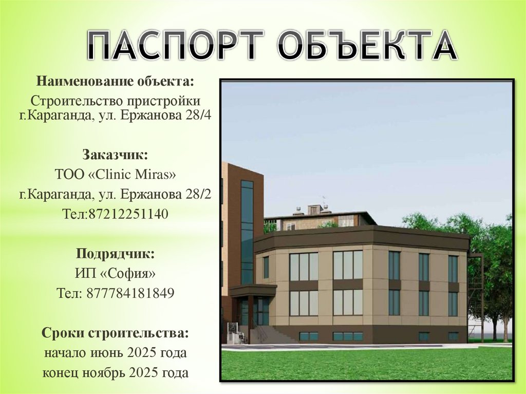 Паспорт объекта: Строительство пристройки г. Караганда, ул. Ержанова 28/4